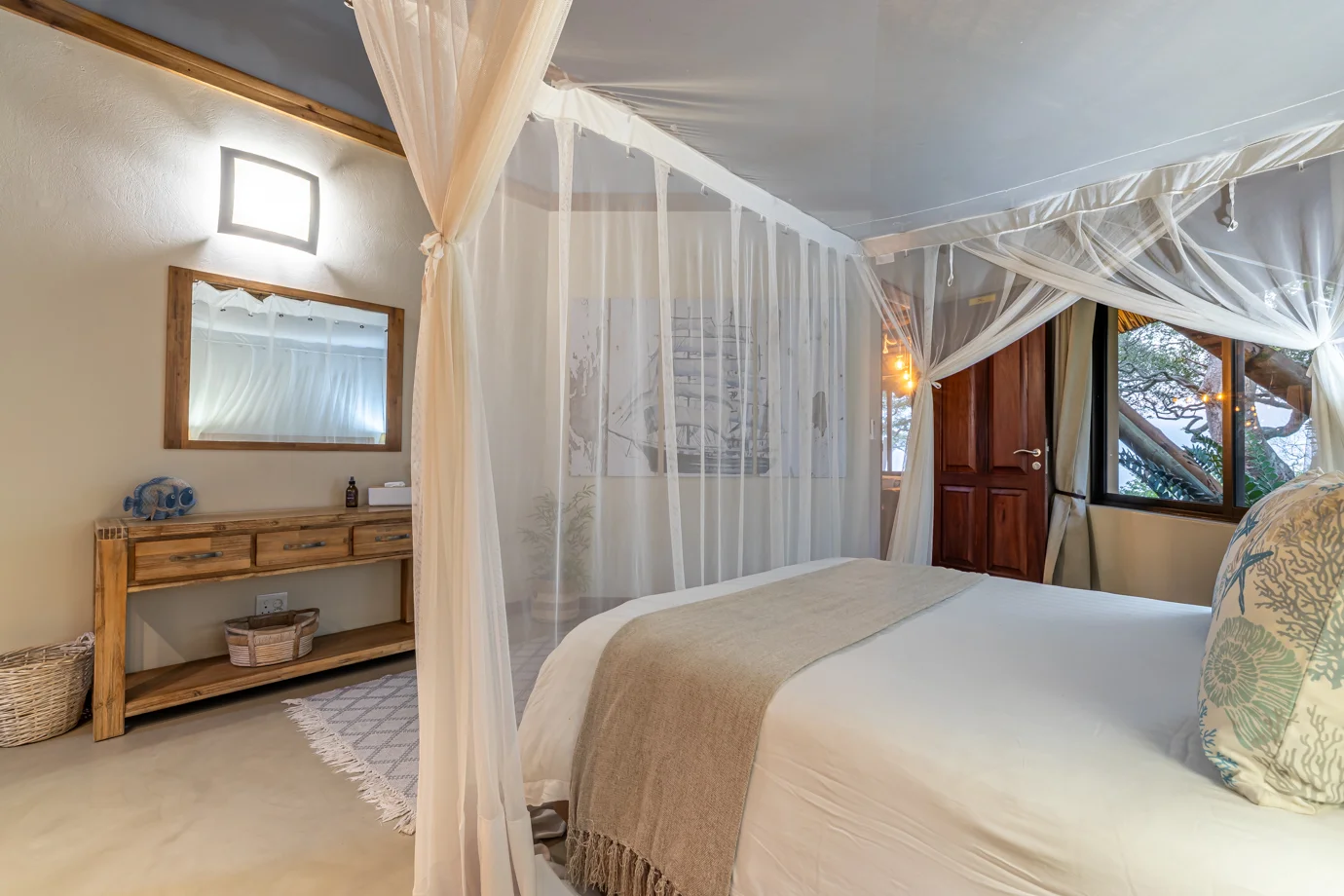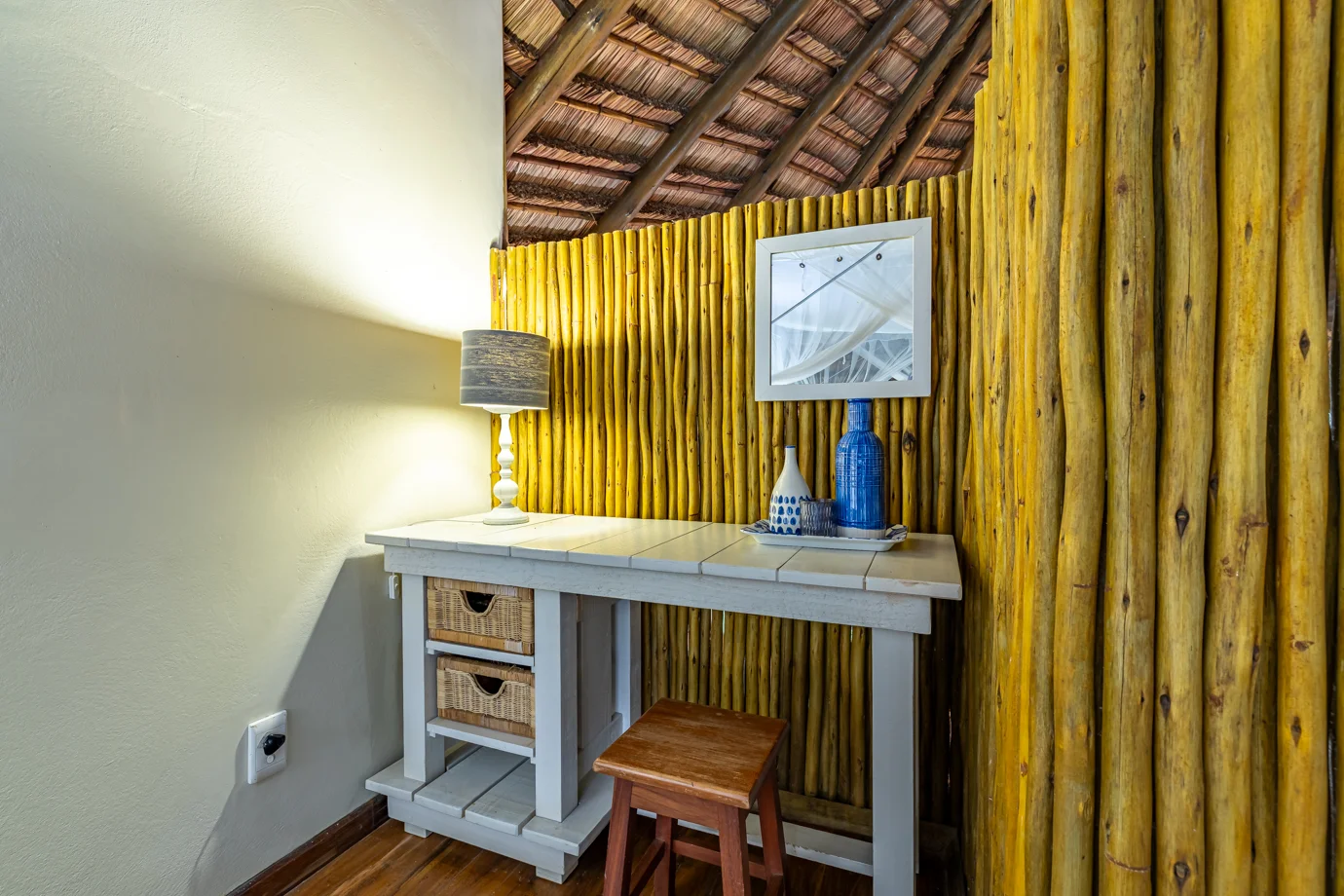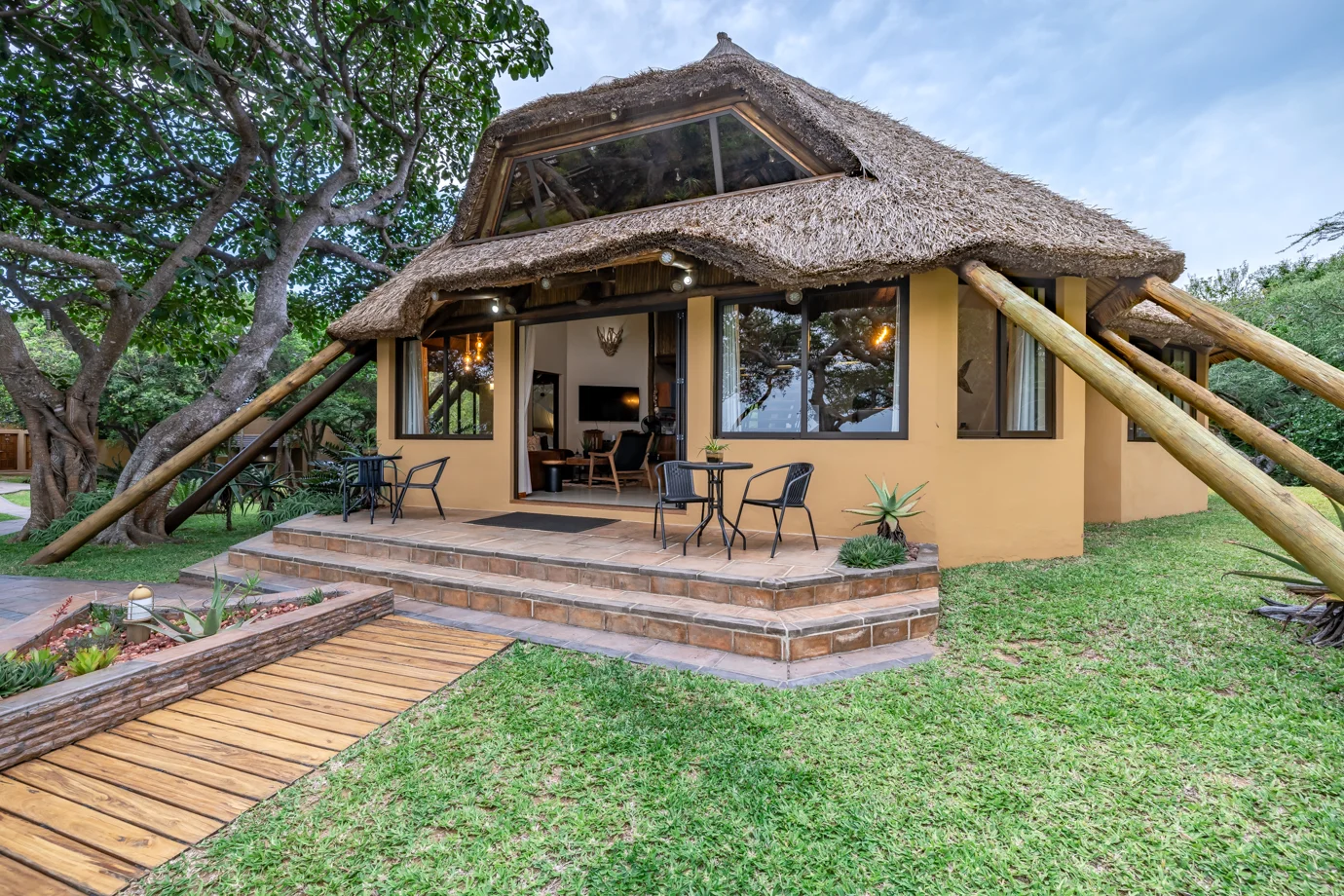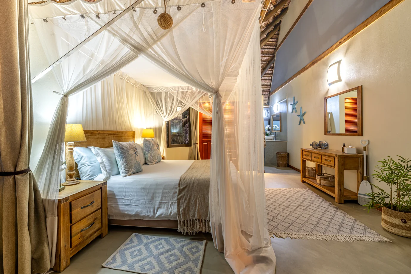 The main house at Nahyeeni Lodge showcases an impressive thatched roof crafted from locally sourced majeka reeds, adding to the unique character of the property. It features two spacious air-conditioned en-suite bedrooms, thoughtfully designed to provide modern comforts and breathtaking views of the gardens with the ocean in the distance. Each room is equipped with a high-end bathroom, ensuring a comfortable and relaxing stay.