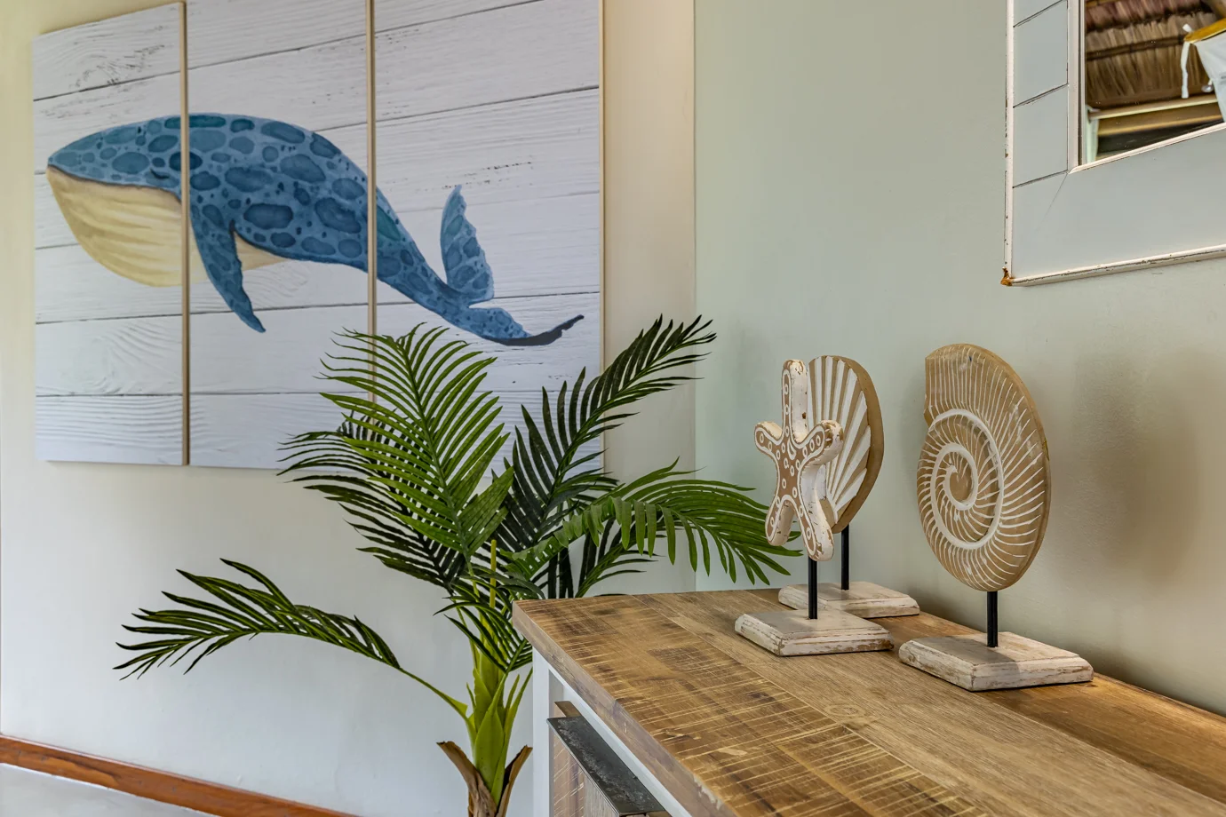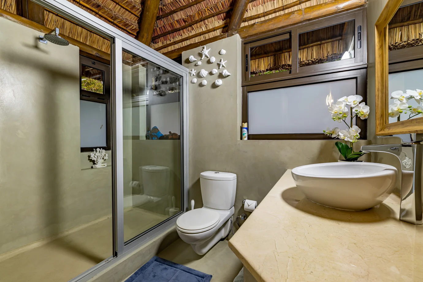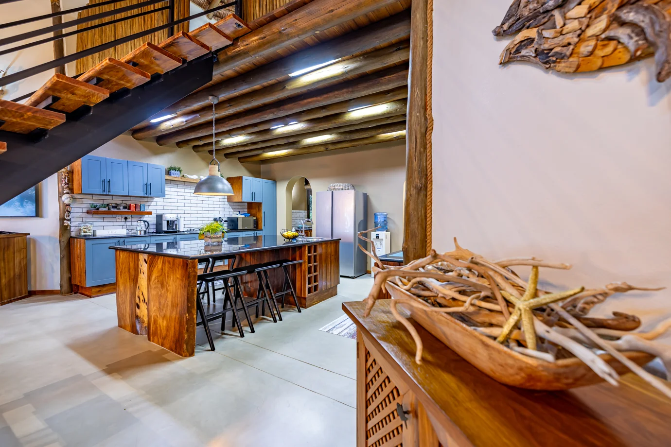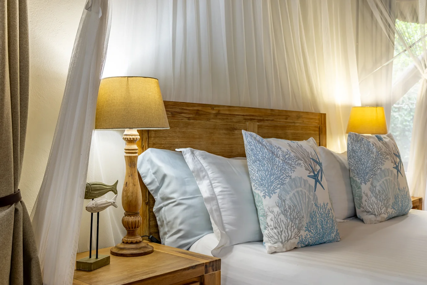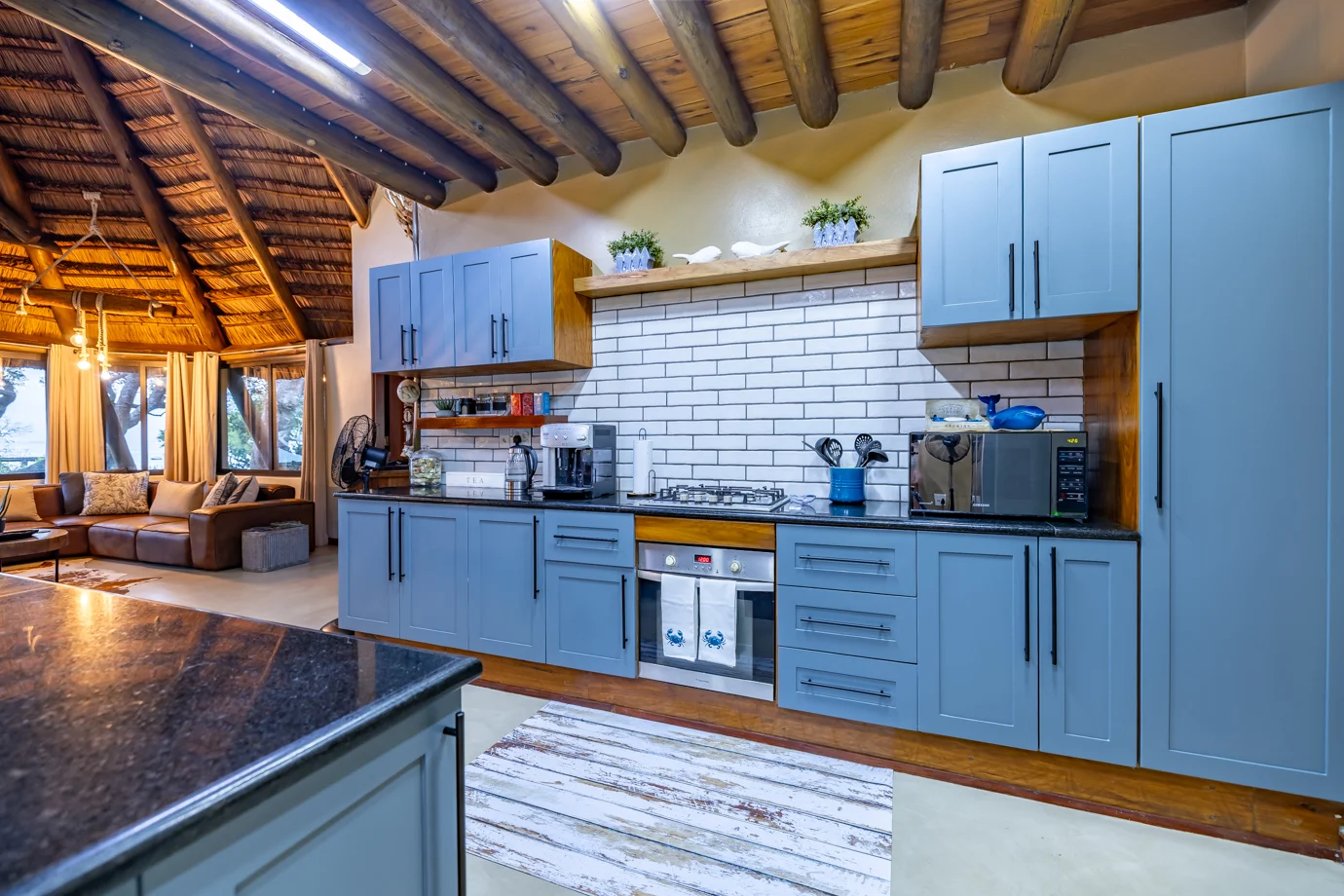 The main house at Nahyeeni Lodge showcases an impressive thatched roof crafted from locally sourced majeka reeds, adding to the unique character of the property. It features two spacious air-conditioned en-suite bedrooms, thoughtfully designed to provide modern comforts and breathtaking views of the gardens with the ocean in the distance. Each room is equipped with a high-end bathroom, ensuring a comfortable and relaxing stay.